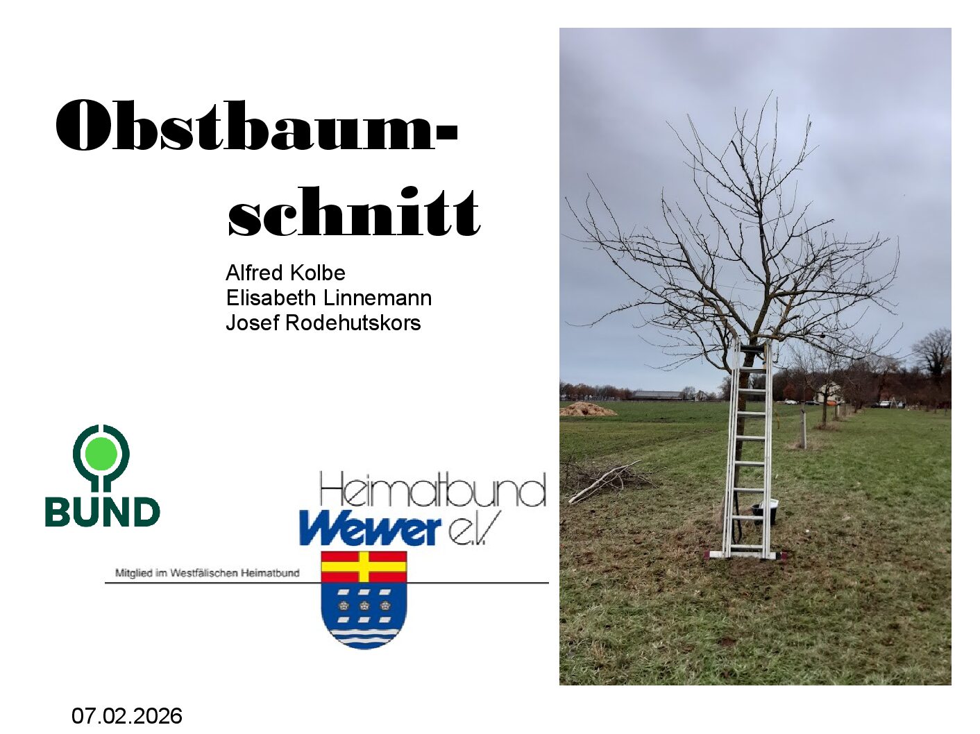 Am 7.02.2026 fand in Kooperation mit dem BUND ein Obstbaumschnittkurs mit dem Schwerpunkt „Jungbaumerziehung“ statt. Nach der Theorie im Heimatbundhaus ging es zum praktischen Teil auf die Wiese am Harten Bruchweg (vor dem Aldi). Die dortigen Obstbäume wurden als Ausgleichsmaßnahme angepflanzt. Unter erschwerten Bedingungen („Vorsicht Tretmine“) konnten dann die erworbenen Kenntnisse von der „Baumansprache“ bis … Weiterlesen