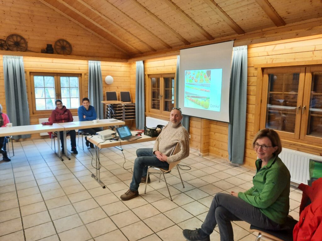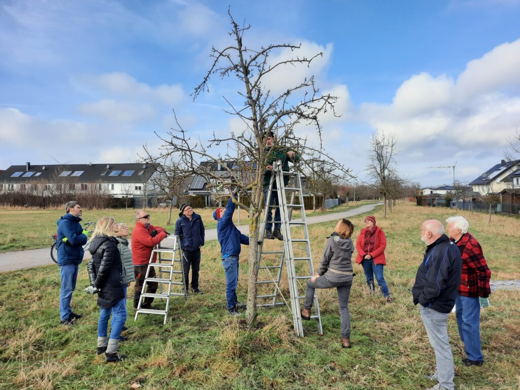 Am 7.02.2026 fand in Kooperation mit dem BUND ein Obstbaumschnittkurs mit dem Schwerpunkt „Jungbaumerziehung“ statt. Nach der Theorie im Heimatbundhaus ging es zum praktischen Teil auf die Wiese am Harten Bruchweg (vor dem Aldi). Die dortigen Obstbäume wurden als Ausgleichsmaßnahme angepflanzt. Unter erschwerten Bedingungen („Vorsicht Tretmine“) konnten dann die erworbenen Kenntnisse von der „Baumansprache“ bis zum „Erziehungsschnitt“ mit dem langfristigen Ziel einer „Oeschbergkrone“ an einigen Bäumen erfolgreich umgesetzt werden.